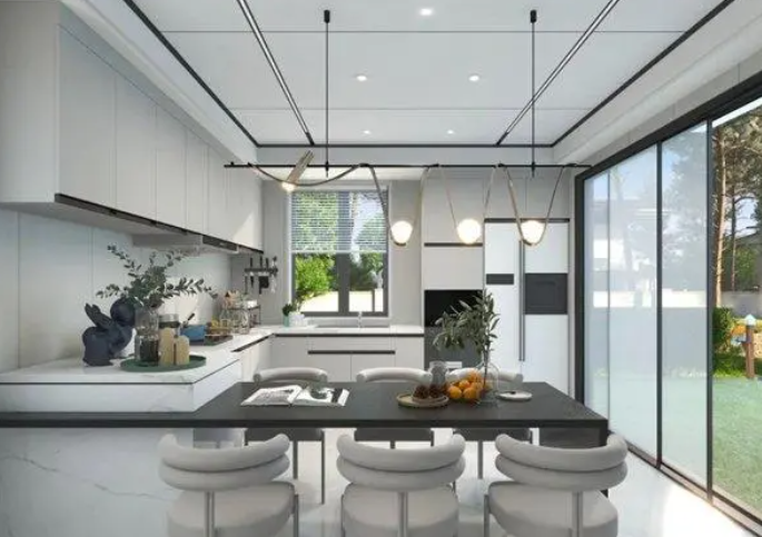 頂部以白色蜂窩大板吊頂,線型燈帶和筒燈相結(jié)合,打造簡約時(shí)尚現(xiàn)代廚房。